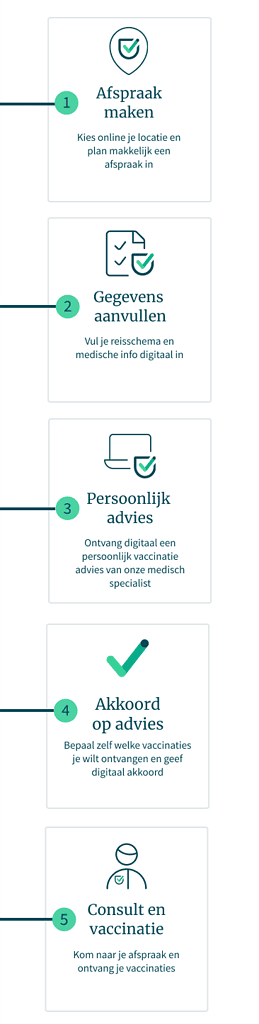 Stap voor stap je vaccinaties geregeld, met persoonlijk advies van onze medisch specialist. Zo ben je goed voorbereid en kan je veilig op reis.