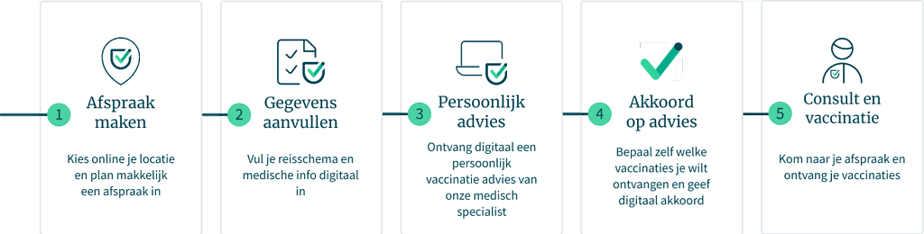 Stap voor stap je vaccinaties geregeld, met persoonlijk advies van onze medisch specialist. Zo ben je goed voorbereid en kan je veilig op reis.